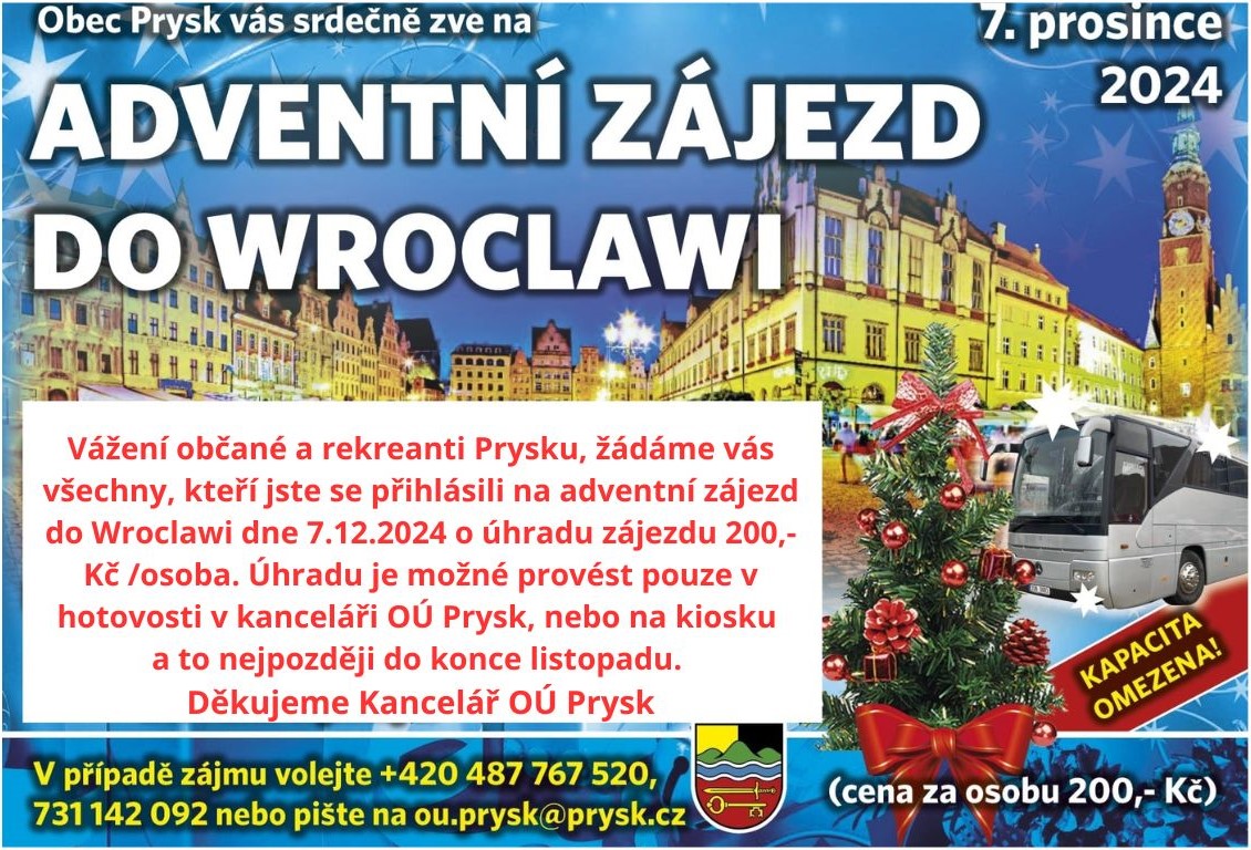 žádáme občany a rekreanty obce Prysk, kteří si zarezervovali místo na adventní zájezd, aby uhradili částku 200Kč/osoba a to nejpozději do konce listopadu. Platba POUZE v hotovosti v kanceláři OÚ nebo na kiosku.